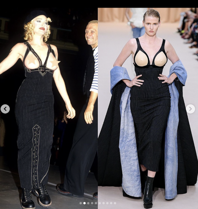El vestido lo usó la Reina del Pop en el desfile de moda amfAR, causó furor y se convirtió en un estandarte de la cultura pop ya que lo lució con los pechos al aire, lo que fue considerado como un símbolo de rebeldía.