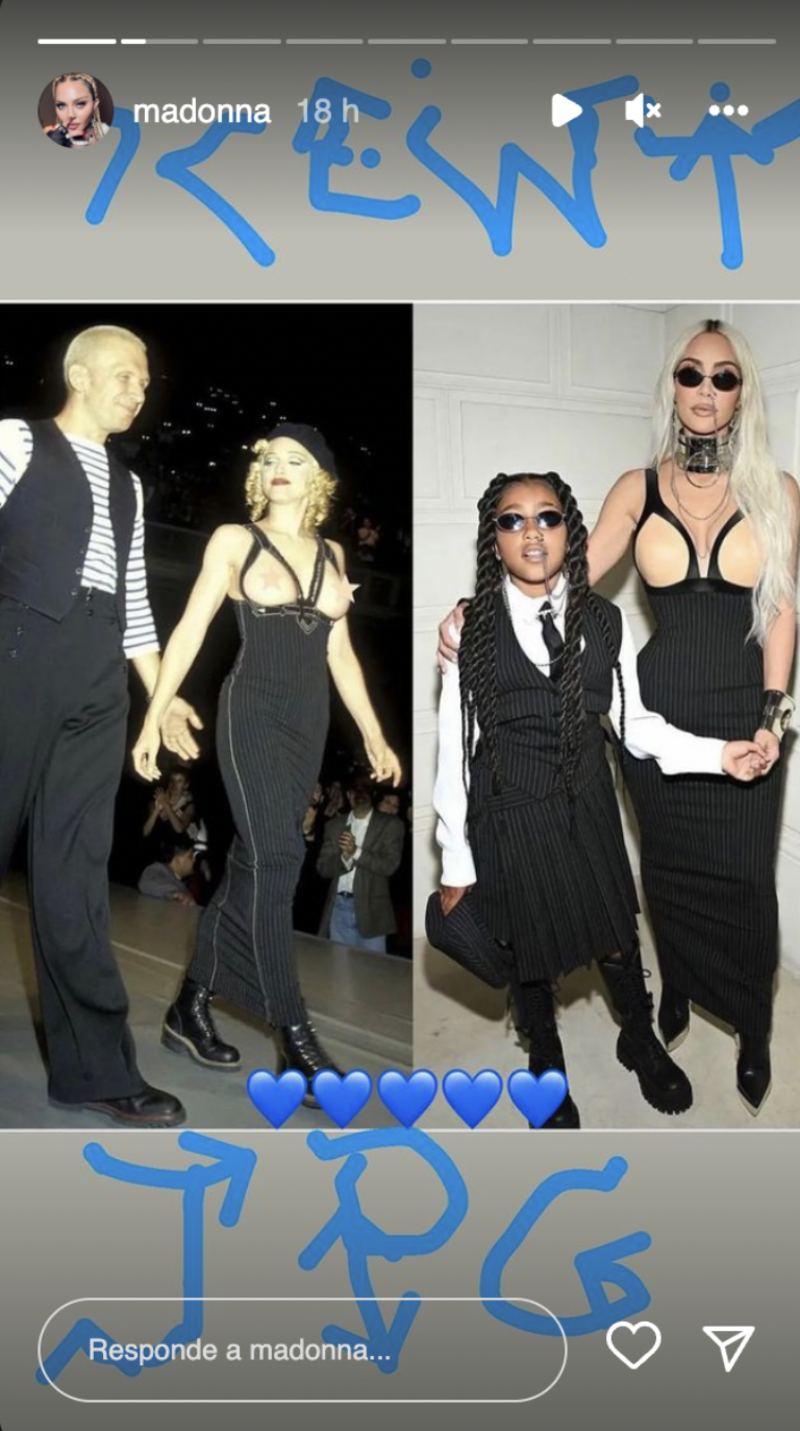 Por medio de sus historias de Instagram, la cantante de Like a Virgin subió una comparativa de ambas en la que se le ve a ella en 1992 junto al diseñador y creador de la icónica prensa y Kim recreando a su estilo el vestido durante la Semana de la Moda de Alta Costura de París.