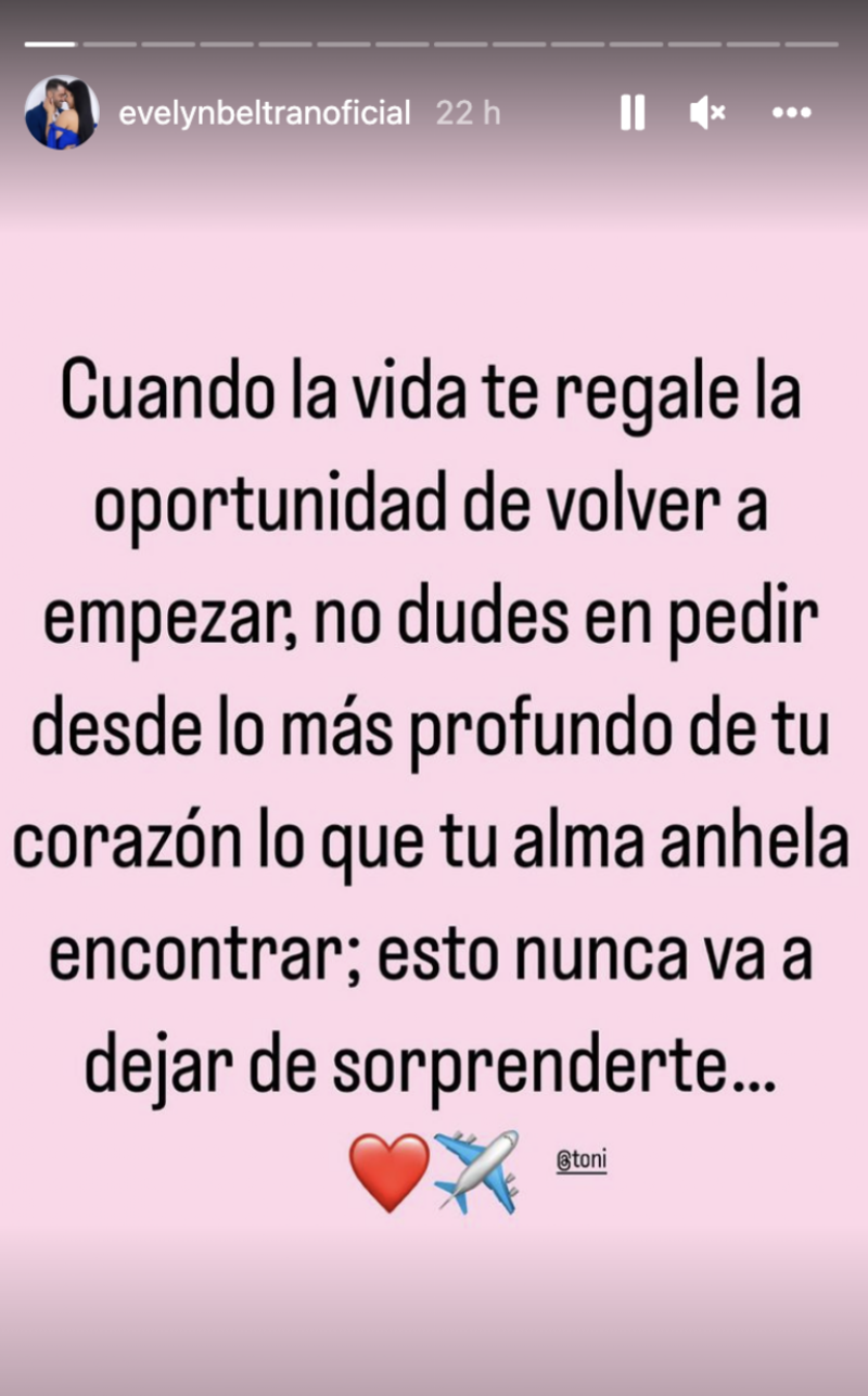 “Cuando la vida te regale la oportunidad de volver a empezar, no dudes en pedir desde lo más profundo de tu corazón lo que tu alma anhela encontrar; esto nunca va a dejar de sorprenderte…”, escribió Evelyn etiquetando al español y agregando emoticones de corazón.