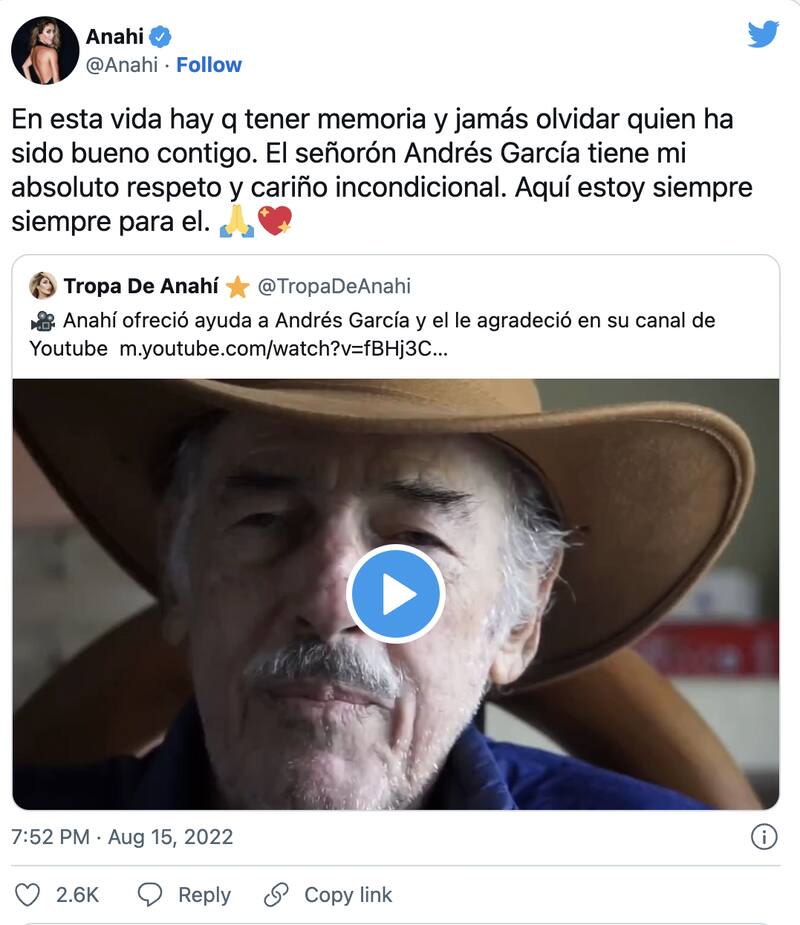 "En esta vida hay que tener memoria y jamás olvidar quién ha sido bueno contigo. El señorón Andrés García tiene mi absoluto respeto y cariño incondicional. Aquí estoy siempre, siempre para él", escribió Anahí, palabras que fueron tomadas por algunos fans como una indirecta para los hijos de Andrés García, quienes no están con él en esta crisis de salud.