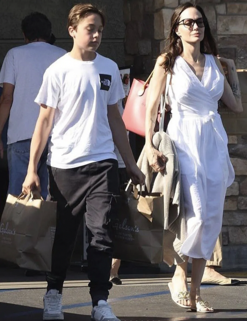El adolescente de 14 años, que tiene a su hermana melliza Vivianne, acompañó a Jolie de compras y en un gesto caballeroso cargó las bolsas mientras su mamá lucía relajada. Knox, que nació del segundo embarazo de la actriz, vistió un pantalón negro, una playera blanca y completó su look con unos tenis.