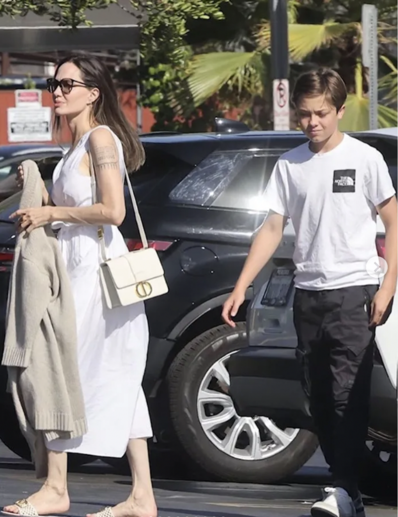 Knox no suele ser captado con Angelina en comparación con sus hermanas Zahara, Shiloh o Vivianne, pero también tiene una gran relación con su mamá, quien en esta ocasión portó un vestido blanco de la firma Vince que combinó con unas sandalias en color crema de Valentino y un bolso del mismo tono Dior.