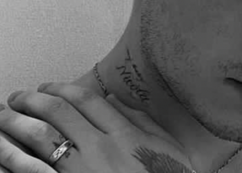 "Nicola, cuando caminaste por el pasillo, me dejaste sin aliento, te ves tan hermosa esta noche y siempre. Déjame comenzar diciendo que las palabras ni siquiera pueden describir mi amor por ti, solo con mirarte veo mi futuro y se siente como un sueño. Eres mi mundo y cada día sigo enamorándome más de ti. Tenerte en mi vida es lo mejor que me ha pasado, ya que me has convertido en el hombre que soy hoy", dice uno de los tatuajes más grandes que tiene el joven.