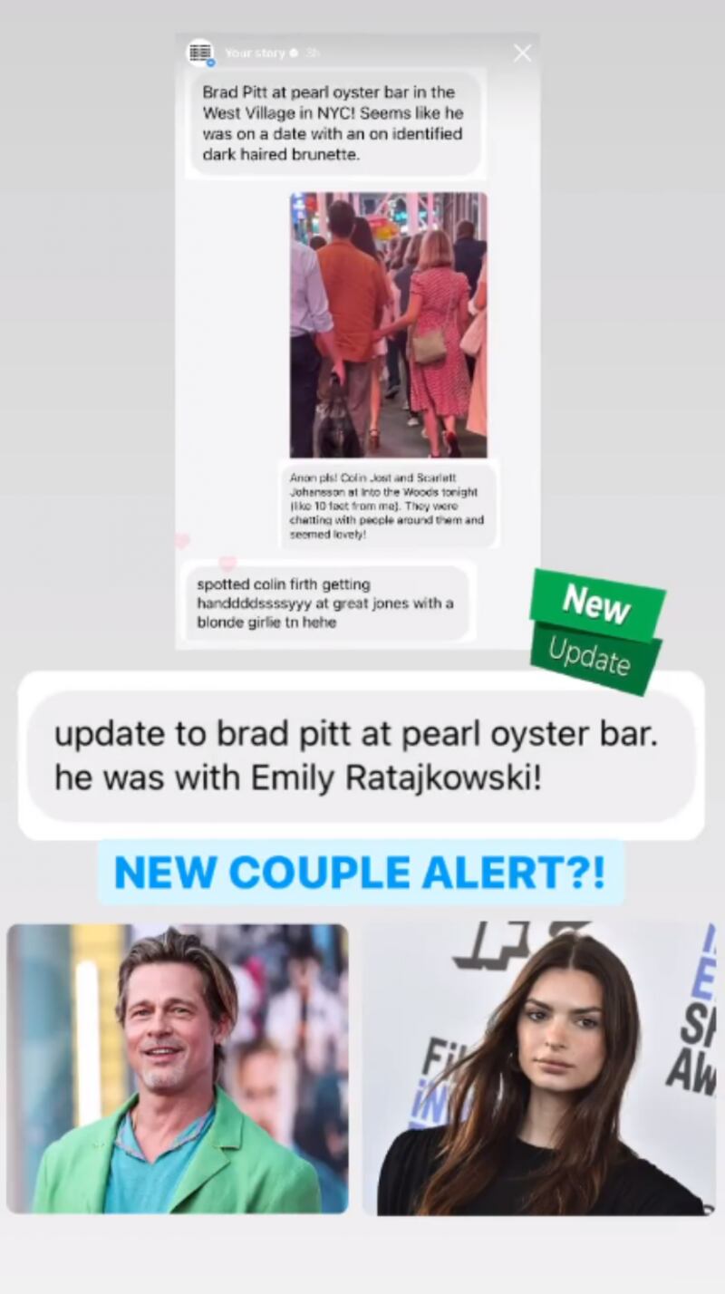 Según comentan, todo surgió luego de que, supuestamente, Brad habría salido de un restaurante junto con la también actriz, pues en redes sociales ya circulan capturas de pantalla de unas fotos de ambos en un encuentro romántico. “Actualización de Brad Pitt en el bar de ostras perlas. ¡Estaba con Emily Ratajkowski! ¿Alerta de nueva pareja?”, se lee en la publicación. Hasta el momento, ninguno de los dos involucrados ha confirmado el romance.