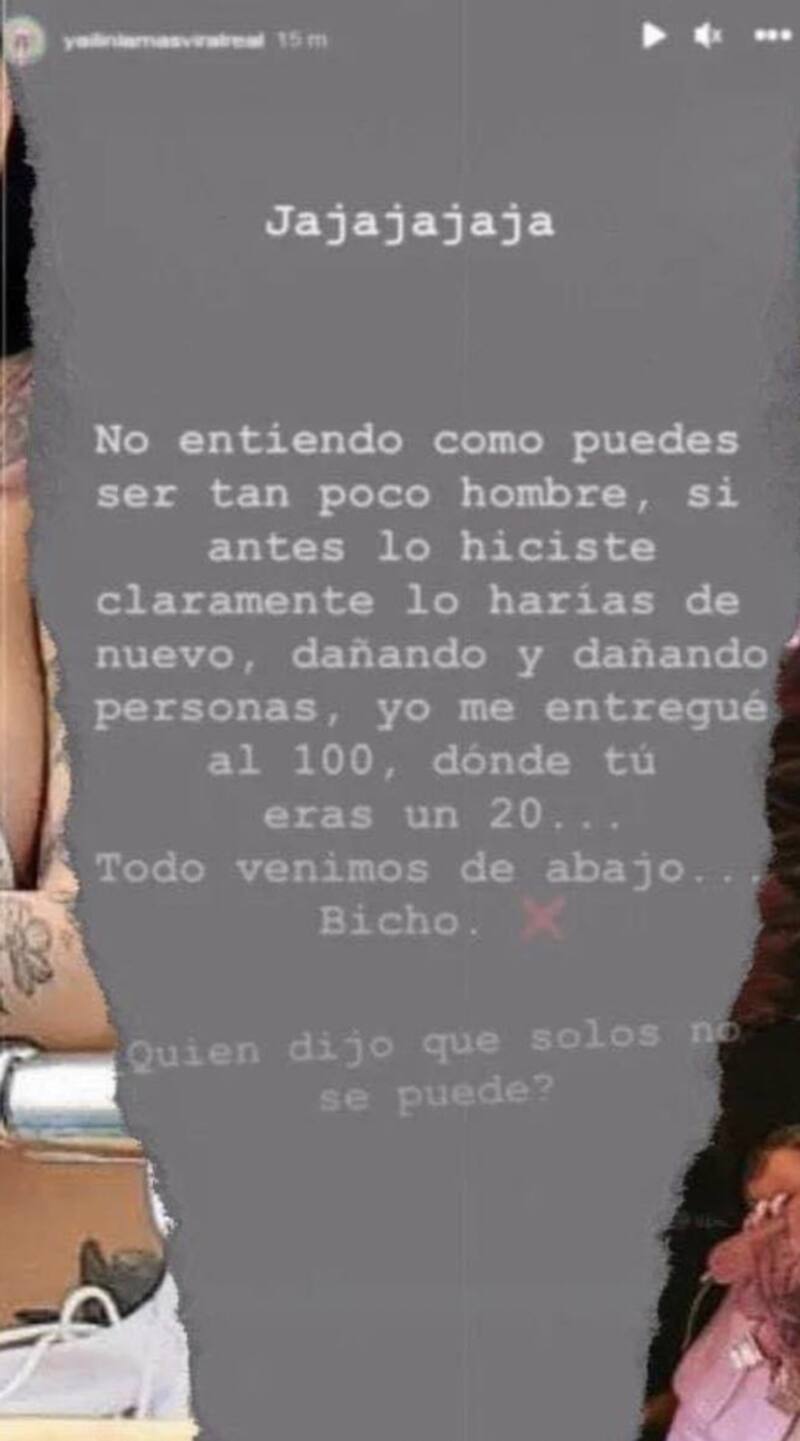 "No entiendo cómo puedes ser tan poco hombre; si antes lo hiciste claramente lo harías de nuevo, dañando y dañando personas, yo me entregué al 100%, dónde tú eras un 20%. Todo venimos de abajo bicho. ¿Quién dijo que solos no se puede?", dice el mensaje que presuntamente escribió la cantante de Chivirika.