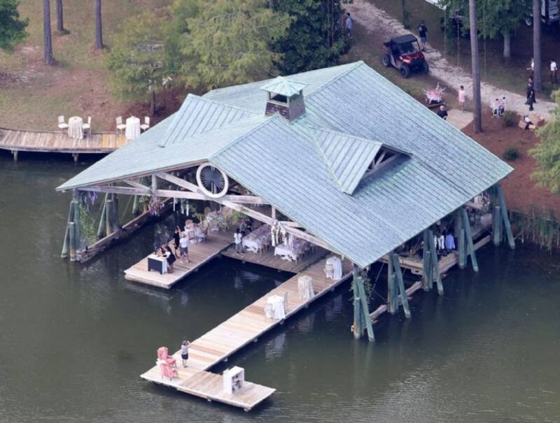 También se pudieron ver sillas rosadas al final del muelle frente a una mesa, donde se espera se realice la ceremonia presidida por el monje hindú Jay Shetty. Siguiendo el camino del muelle, se divisa una glorieta repleta de sillas y mesas adornadas en tonos pastel, cerca de lo que parece ser una tarima para la presentación de música en vivo.