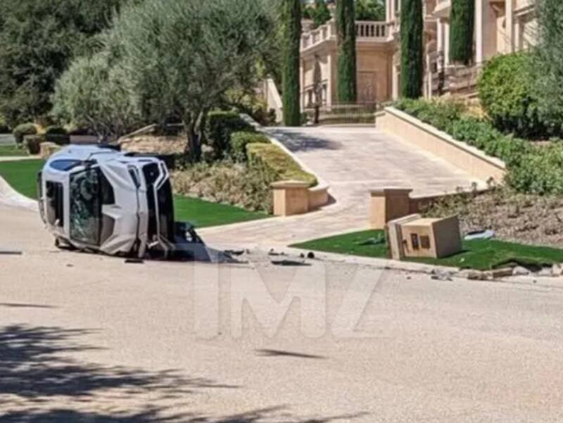 El ex de Kourtney se estrelló contra un buzón de piedra, mismo que aparece en las imágenes tirado sobre el césped. A una corta distancia se aprecia el SUV Lamborghini de Scott volcado y con los cristales rotos.