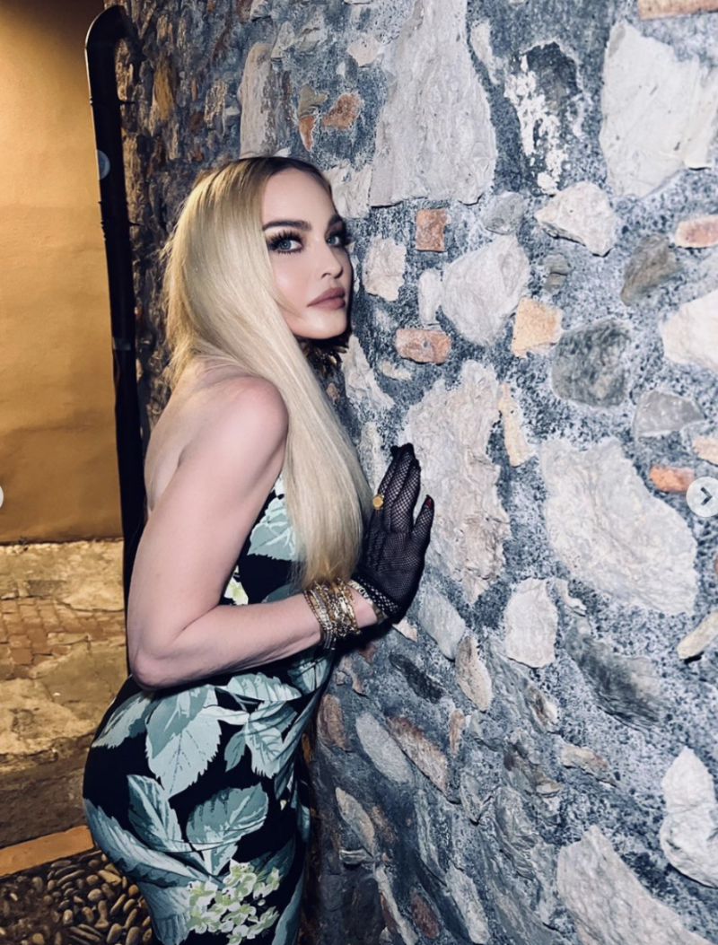 En las fotos, Madonna lució un ceñido vestido con estampado de plantas verdes. Además, complementó su propuesta con varios collares largos y guantes de red, y un peinado que dejó su larga cabellera rubia suelta.