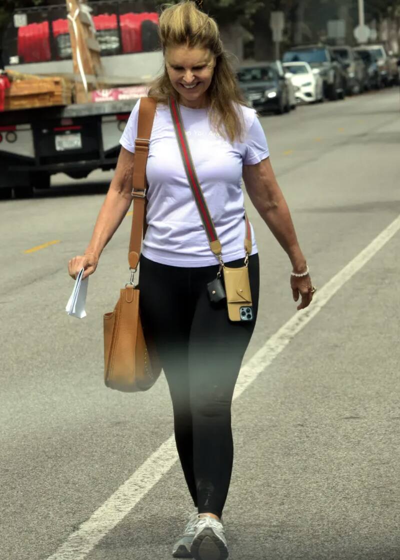 Durante su caminata, la ex del actor de Terminator lució una vestimenta muy casual con leggins color negros, una camiseta informal en tono lila tenis, un accesorio para su celular y una bolsa de piel en el hombro.