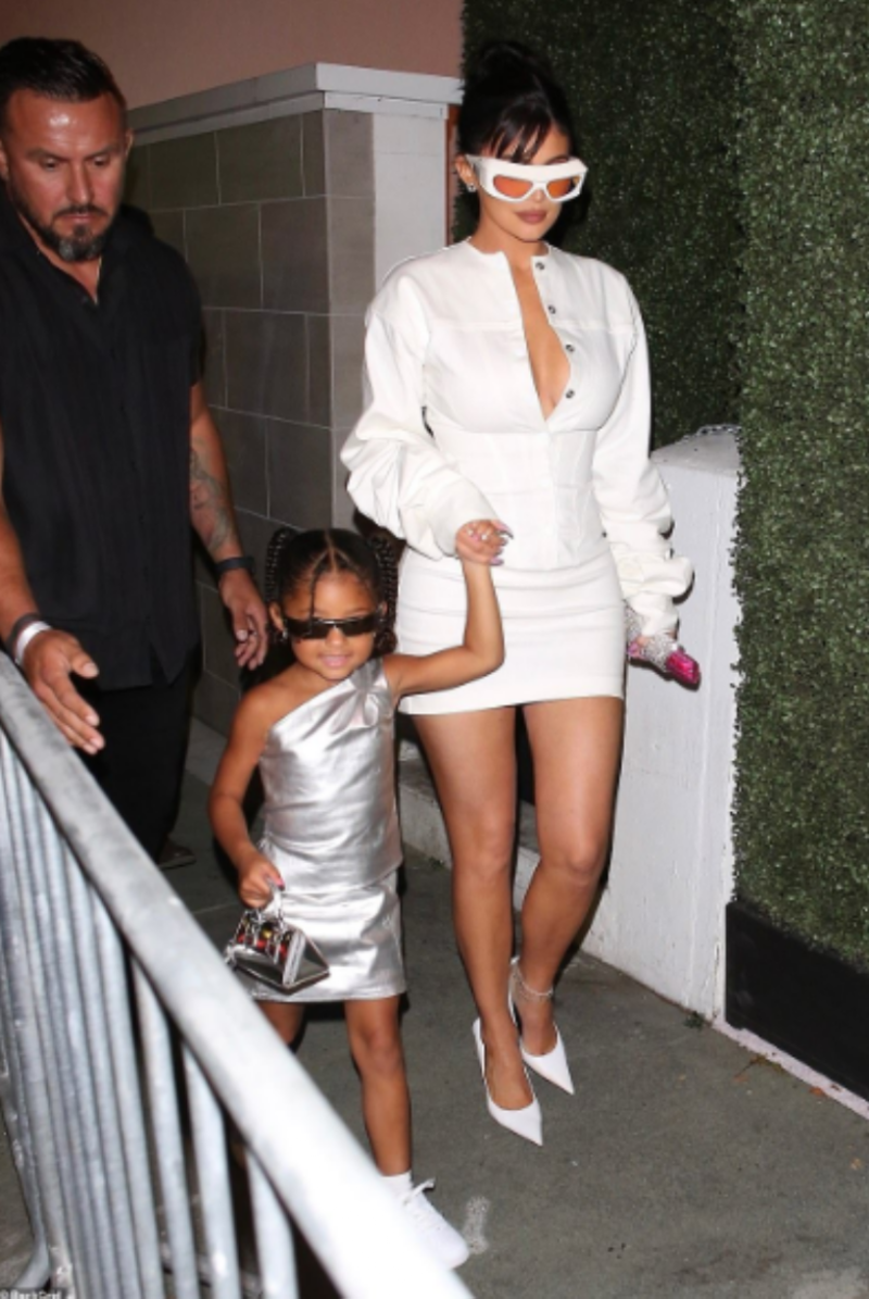 Para este importante evento al que se dieron cita varias celebridades, Jenner tenía que lucir radiante al ser la anfitriona, por lo que la socialité, quien llegó acompañada de su hija Stomi, se enfundó en un mini vestido blanco con pronunciado escote, tacones de aguja y gafas de sol futuristas que hicieron juego con todo su outfit.