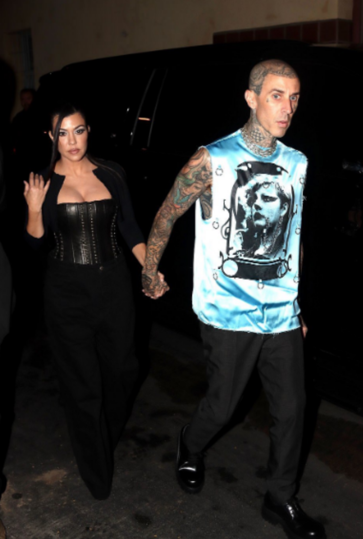 Kourtney en un pantalón holgado con un corsé de cuero negro y Travis con su camiseta azul sin mangas, para dejar al descubierto sus tatuajes, se dieron tiempo para posar ante las cámaras de los fotógrafos que presenciaron el evento.