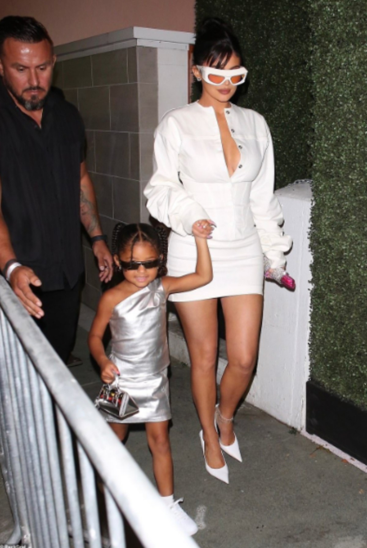 Para este importante evento al que se dieron cita varias celebridades, Jenner tenía que lucir radiante al ser la anfitriona, por lo que la socialité, quien llegó acompañada de su hija Stomi, se enfundó en un mini vestido blanco con pronunciado escote, tacones de aguja y gafas de sol futuristas que hicieron juego con todo su outfit.