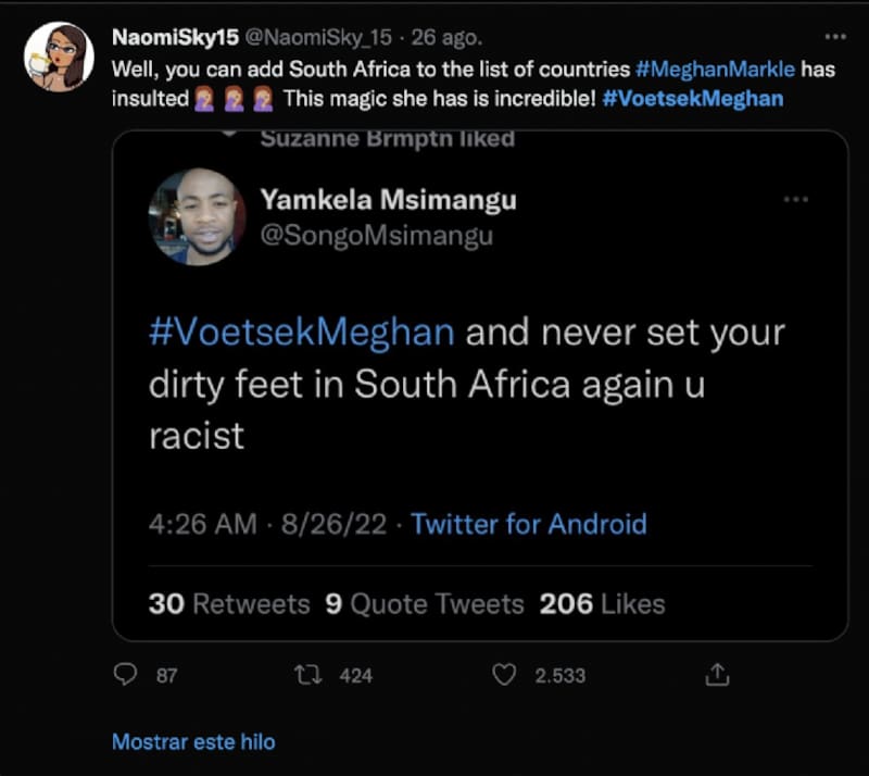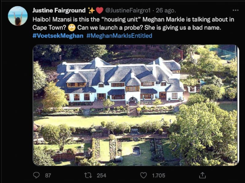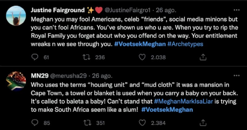 En Twitter, los habitantes de Sudáfrica llenaron de comentarios, incluso el hashtag VoetsekMeghan, que significa “vete Meghan”, se hizo tendencia durante varias horas.