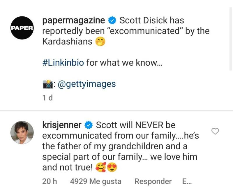 Otro de los medios que destapó el rumor fue la revista Paper Magazine, que a través de una publicación expusieron que “Scott Disick era reportado como excomulgado de las Kardashian”, comentario que no le hizo gracia a la empresaria y decidió responder en sobre este mismo posteo.