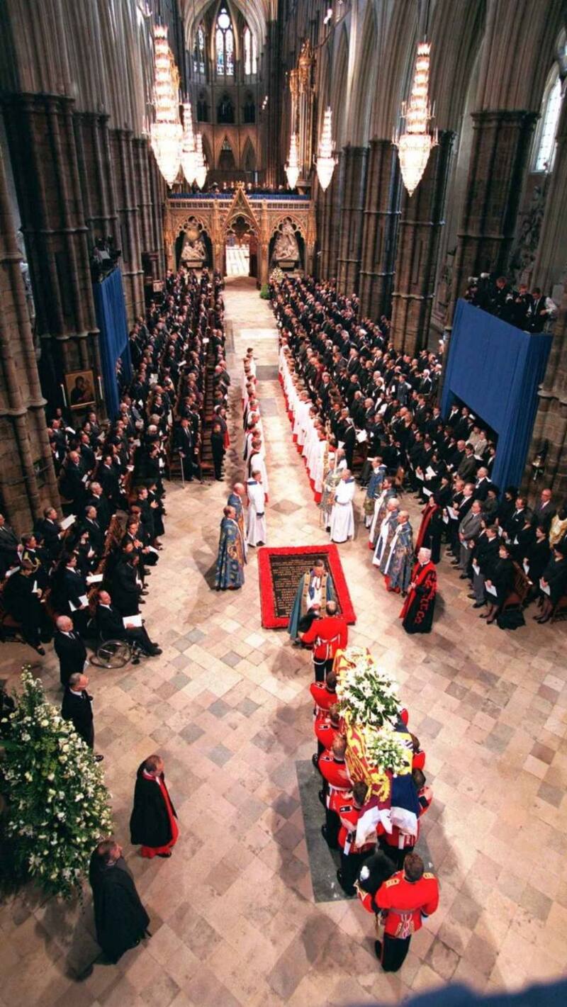 William y Harry siguieron el ataúd, acompañados por Carlos, Philip y Charles Spencer. Unos 2.500 millones de televidentes los vieron en todo el mundo. En la Abadía de Westminster había dos mil invitados. Entre ellos, la primera dama estadounidense, Hillary Clinton; Tony Blair; el cantante de ópera Luciano Pavarotti; la ex primera ministra Margaret Thatcher, y la estrella de cine Tom Cruise. Elton John adapta su canción "Candle in the Wind", dedicara originalmente a Marilyn Monroe, con un nuevo comienzo: "Adiós rosa inglesa", en homenaje a Diana.