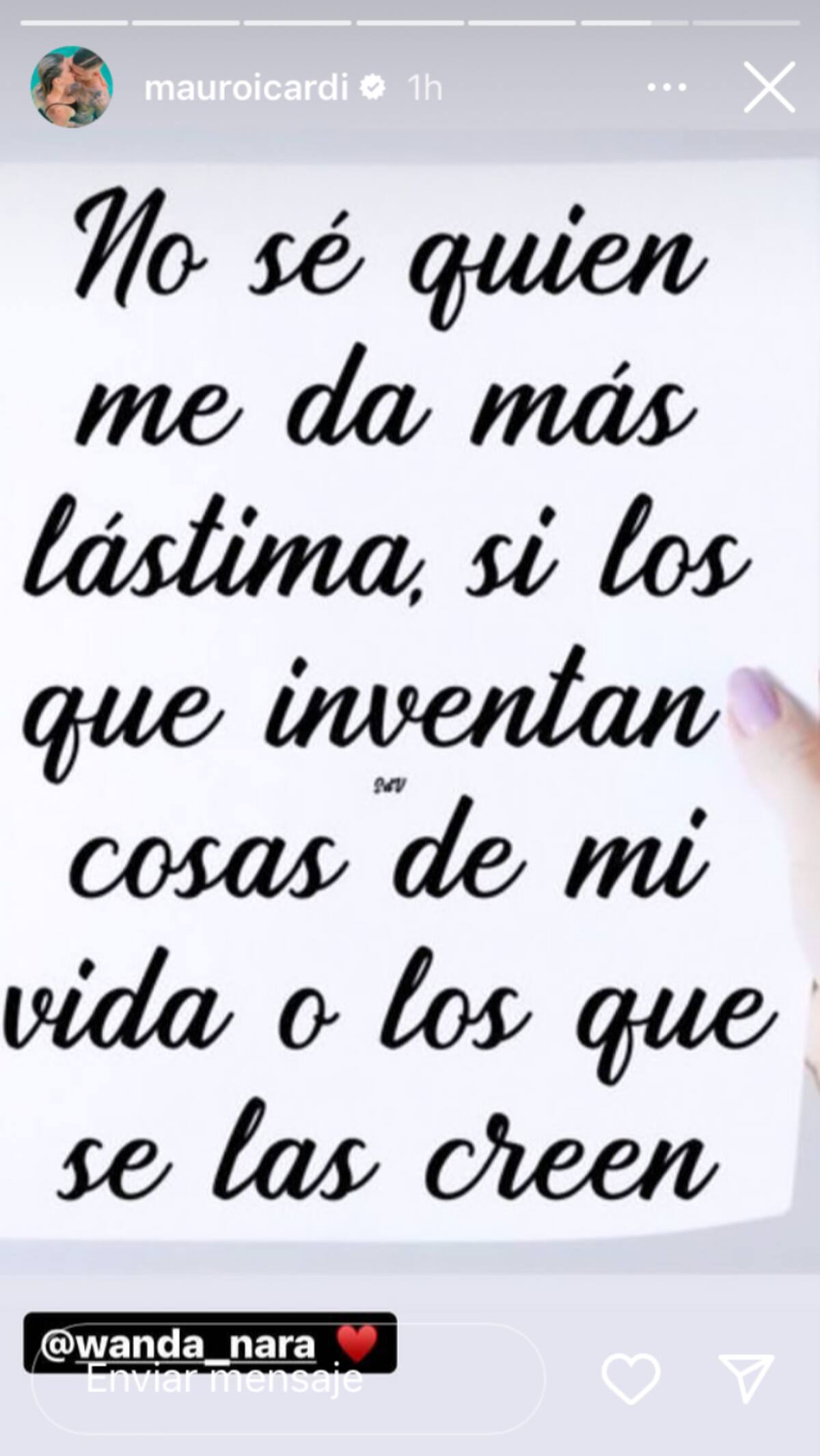 “Estoy organizando un poco las cosas para el divorcio, porque no puedo más y porque le pedí el divorcio”, enuncia Wanda en el audio que mostraron en el programa. La pareja ya no ha hablado del tema, lo único que se tiene es el mensaje que dejó Icardi y aunque etiquetó a su esposa, esta no re posteó el escrito y sólo se ha dedicado a compartir lo que hace en su día.