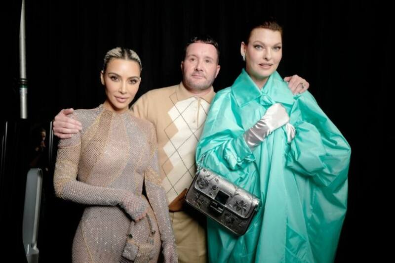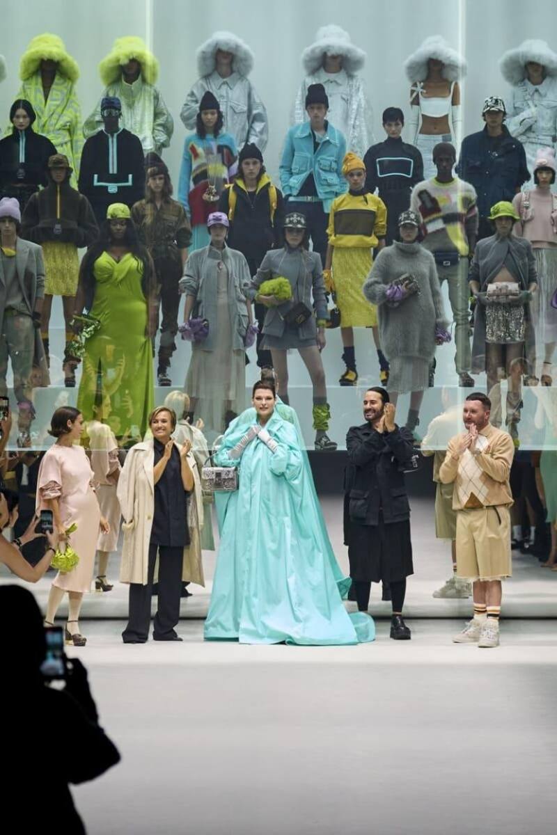 En el desfile, Linda Evangelista lució un increíble traje celeste para conmemorar el 25° aniversario del bolso más mítico de Fendi, el baguette. El diseño fue presentado originalmente en 1997 y se posicionó como uno de los bolsos más revolucionarios de la industria de la moda, y ahora ha sido reinventado en una colaboración con Tiffany & Co.