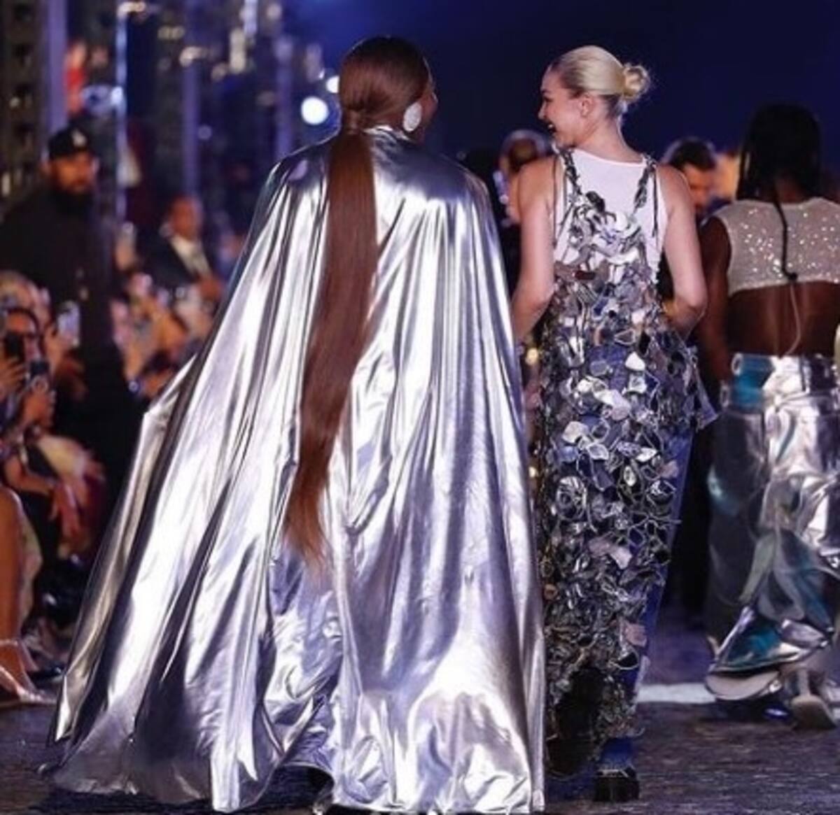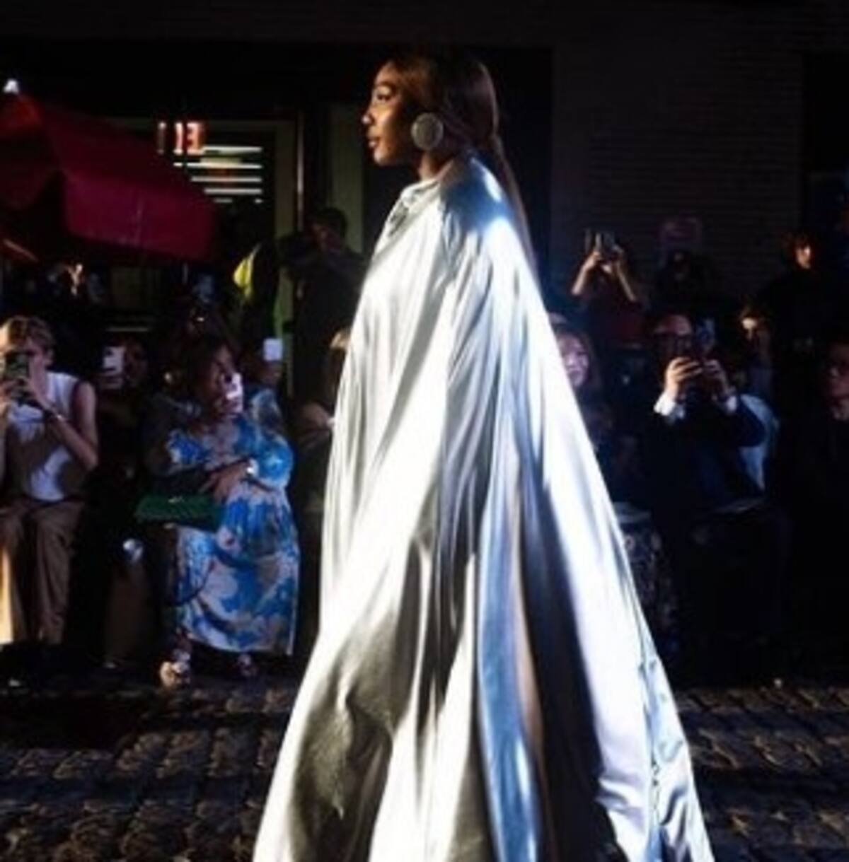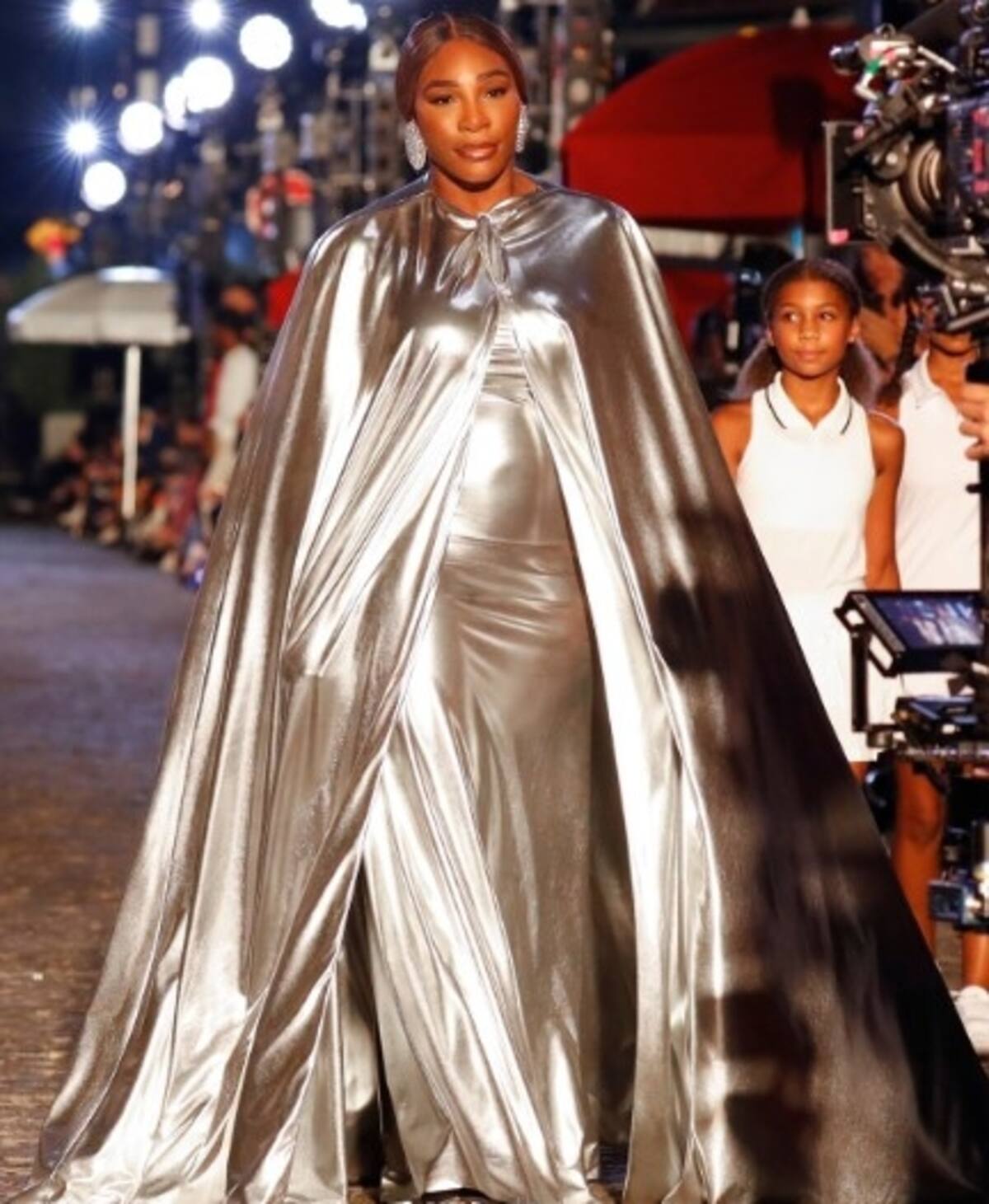 La jugadora desfiló por la pasarela en el espectáculo de moda y estuvo en la apertura del desfile con un vestido sin mangas plateado personalizado de Balenciaga, que combinó con una capa hasta el suelo. La ex tenista estuvo acompañada por cuatro niñas pasapelotas que lucían vestidos de tenis blancos, que complementaron con raquetas.