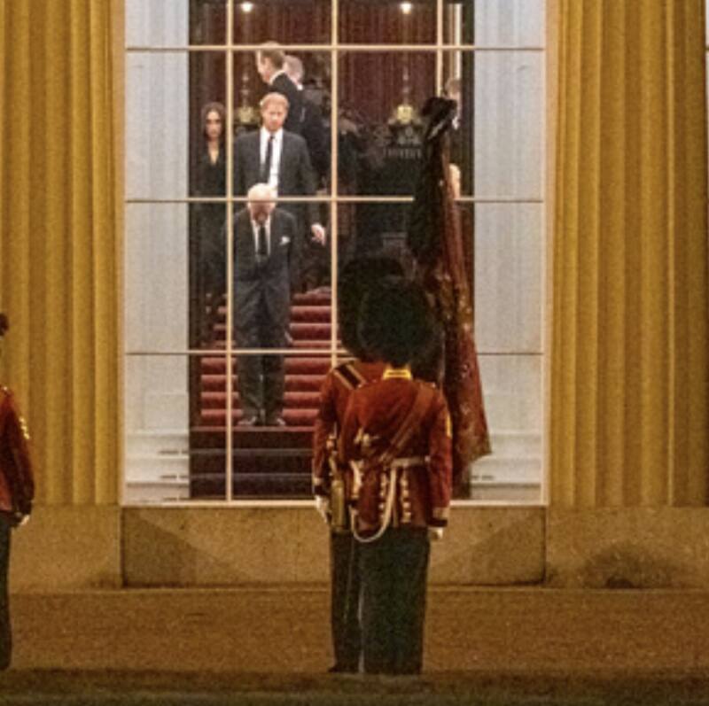 Una noche antes el cuerpo de Su Majestad fue recibido por su familia en el Palacio de Buckingham, ahí se reunieron con el nuevo monarca y el resto de la familia real Harry y su esposa Meghan Markle (41) y aunque no hubo fotos del íntimo momento, el periodista especializado en temas de realeza, Omid Scobie, publicó en su cuenta de Twitter la primera imagen del rey junto a su hijo menor y su nuera.