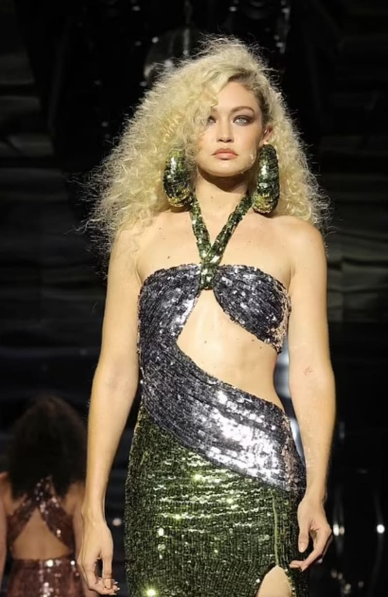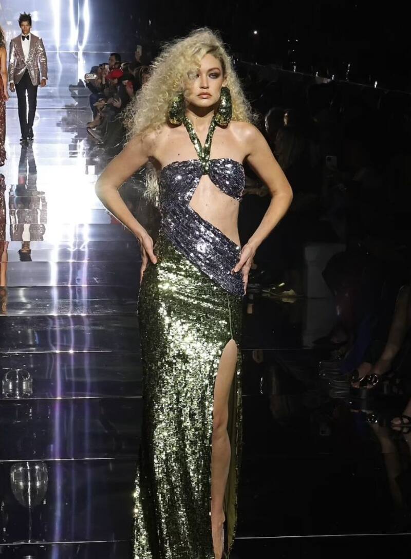 Ya en la Fashion Week , Hadid deslumbró. Como parte de la colección Primavera/Verano 2023 de Tom Ford, la también actriz lució un vestido verde con plateado de lentejuelas que tenía una abertura que iba desde el pecho hasta la cintura. Su melena rubia tenía un estilo de los 80’s, que combinó con un smokey eyes ahumado y arracadas grandes del mismo tono del vestido; Bella Hadid, su hermana, también desfiló por la pasarela con un look de lentejuelas.