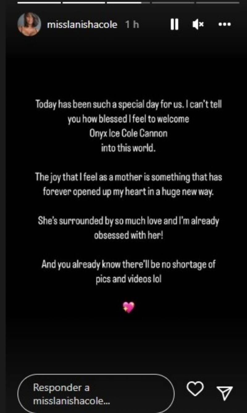 Cole, de 40 años, también compartió una foto de su hija en su cuenta de Instagram: “Hoy ha sido un día tan especial para nosotros”, escribió más tarde en su historia de Instagram. “No puedo decirte lo bendecido que me siento de dar la bienvenida a Onyx Ice Cole Cannon a este mundo”.