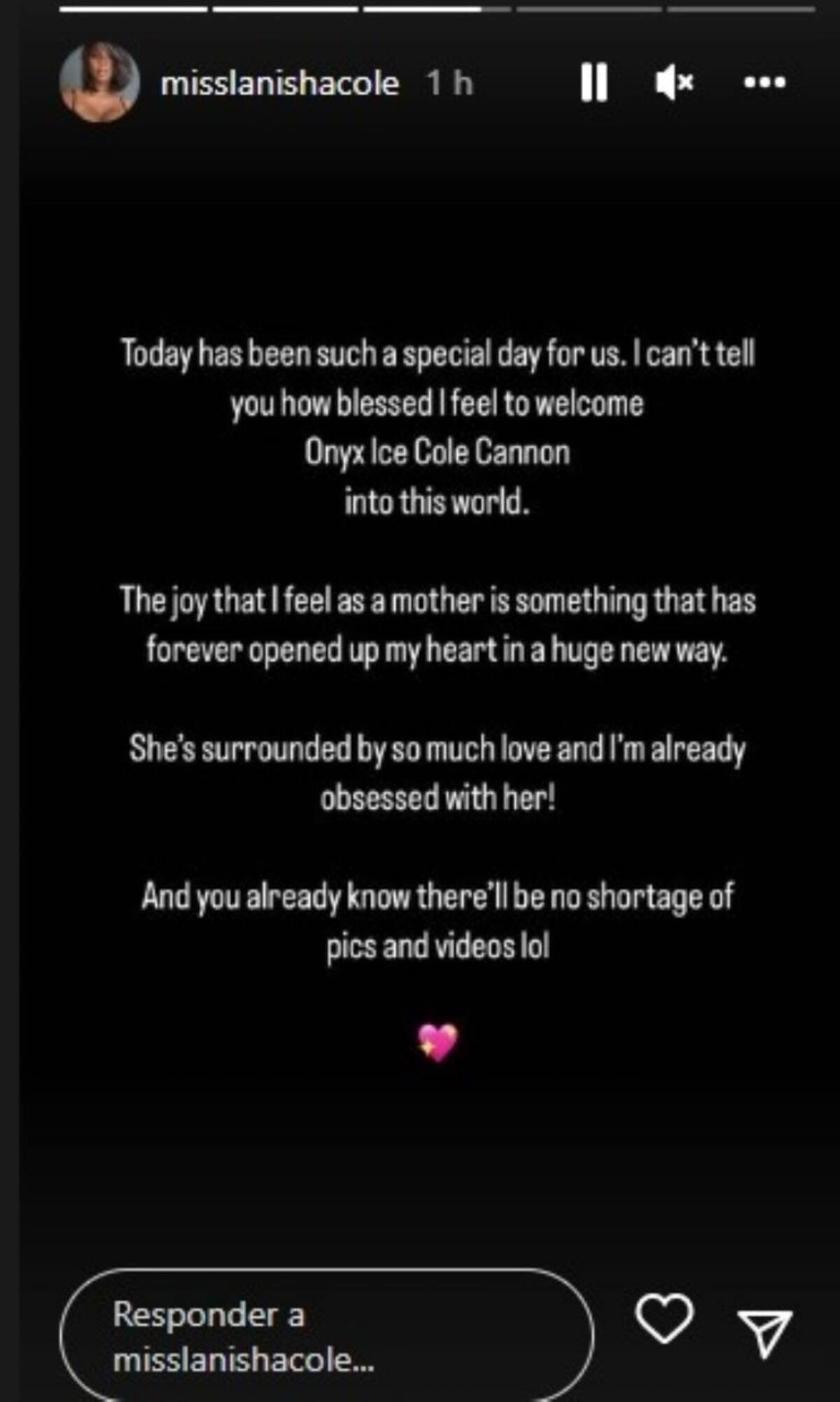 Cole, de 40 años, también compartió una foto de su hija en su cuenta de Instagram: “Hoy ha sido un día tan especial para nosotros”, escribió más tarde en su historia de Instagram. “No puedo decirte lo bendecido que me siento de dar la bienvenida a Onyx Ice Cole Cannon a este mundo”.