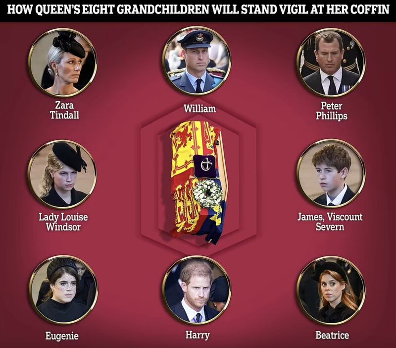 Los ocho nietos de la reina, incluidos el príncipe William y el príncipe Harry, permanecerán en vigilia junto a su ataúd durante 15 minutos.