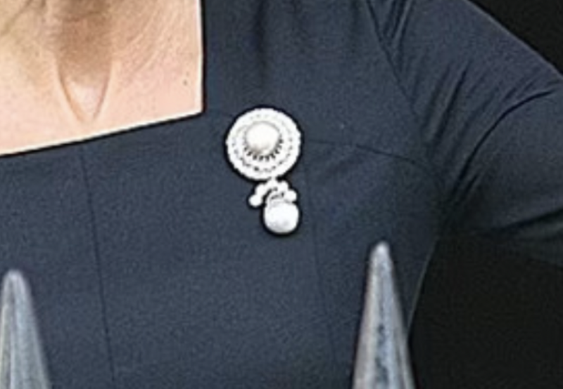 Al igual que lo ha hecho la reina Camila (75), Kate Middleton (40) y Meghan Markle (41), Letizia hizo gesto a la fallecida soberana mediante una joya. La reina de España eligió un vestido sencillo con un escote cuadrado del que resaltaba un broche Ena de brillantes que en el centro poseía una enorme perla de color gris, del que cuelga una perla mucho más grande.