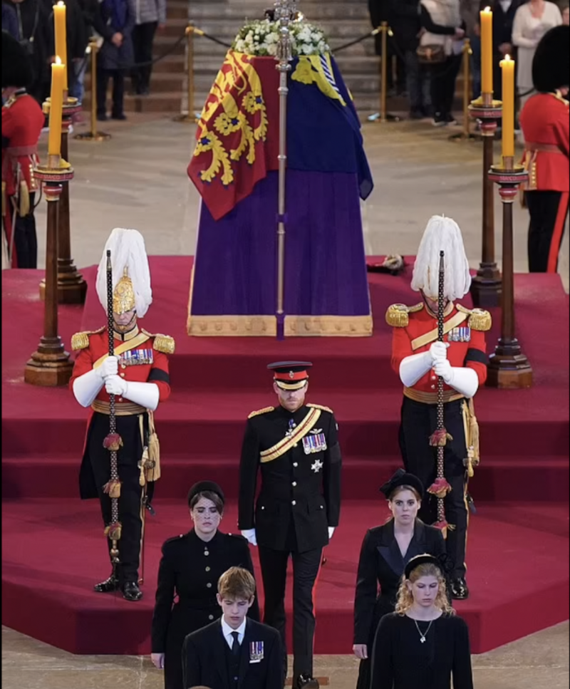 Este sábado los nietos de la reina Isabel llegaron a Westminster minutos después de las 6:00 pm, hora local, para presentar su respeto a su abuela en una vigilia única en su tipo. Encabezada por el príncipe de Gales y su hermano, el príncipe Harry (38) ataviados con su uniforme militar, fueron seguidos de las princesas Beatriz (34) y Eugenia (32), Zara Tindall (41) y Peter Phillips (44), Lady Luisa Windsor (18) y su hermano menor James.