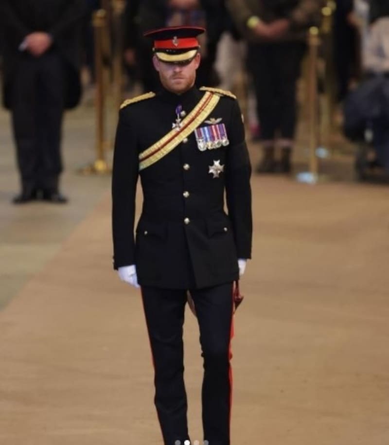 Distinto fue la expresión de Harry, quien a juicio de Judi James, "caminó detrás de su hermano con una mirada reflexiva y un ligero movimiento de mandíbula. Su postura y su andar en la marcha reflejaban orgullo por volver a vestir el uniforme, pero en general se trataba más de una experiencia tranquilamente emocional. En su uniforme, se volvió militar: inexpresivo y erguido con su boca apretada como una suave línea horizontal".