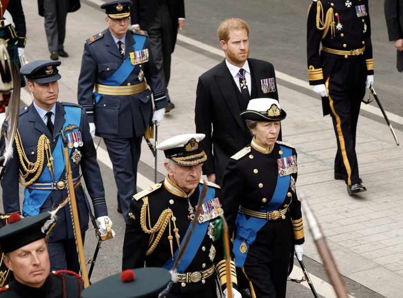 Antes del servicio, Harry fue visto haciendo tregua con su hermano, el príncipe William, para caminar junto a él detrás del ataúd de la reina. El duque de Sussex vestía un traje de civil en lugar de un uniforme militar, debido a que ya no es miembro de la realeza.