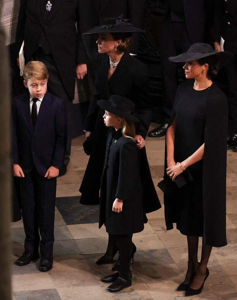 Meghan Markle entró a la abadía en procesión detrás del ataúd de la monarca junto a la princesa de Gales, Kate Middleton y sus dos hijos mayores, además del príncipe Eduardo con Sophie.