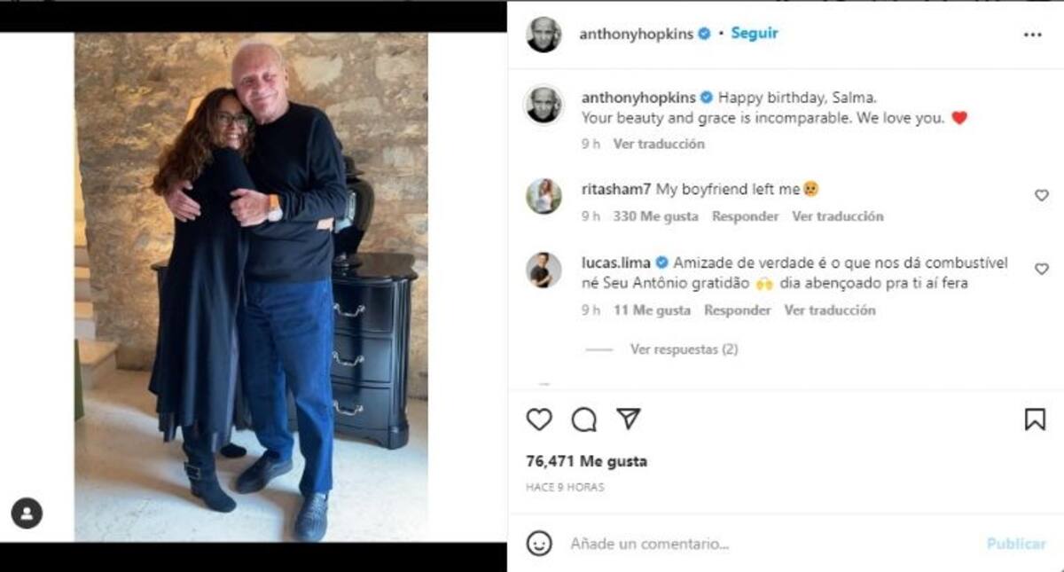 “Feliz cumpleaños, Salma. Tu belleza y gracia es incomparable. Te amamos @Salma Hayek”, escribió el protagonista de El silencio de los inocentes, palabras que acompañó con una fotografía en la cual salen abrazados.