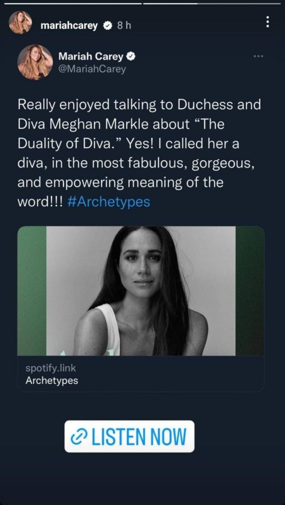 A través de su cuenta de Twitter, la cantante de “All I Want for Christmas Is You” escribió a sus 21 millones de seguidores: “Realmente disfruté hablar con la duquesa y la diva Meghan Markle sobre 'La dualidad de la diva'. ¡Sí! ¡¡¡La llamé diva, en el sentido más fabuloso, hermoso y empoderador de la palabra!!”