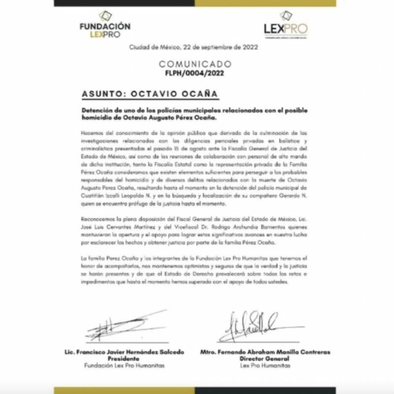 Al respecto, la familia del fallecido actor de Vecinos en conjunto con la Fundación Lexpro, emitió un comunicado para pronunciarse sobre la detención del policía acusado de privar de la vida a Ocaña, quien murió a los 22 años tras una persecución con autoridades.