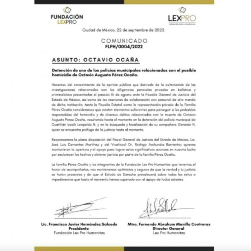 Al respecto, la familia del fallecido actor de Vecinos en conjunto con la Fundación Lexpro, emitió un comunicado para pronunciarse sobre la detención del policía acusado de privar de la vida a Ocaña, quien murió a los 22 años tras una persecución con autoridades.