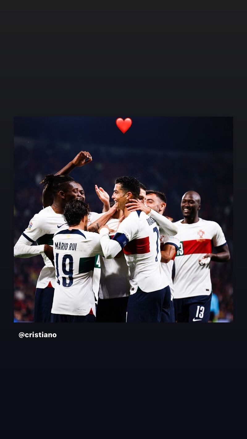A través de sus stories de Instagram, la empresaria y esposa del delantero del Manchester United, le mostró su solidaridad al también padre de sus hijos, subiendo una fotografía del futbolista junto con el equipo celebrando la victoria de su selección al quedar 4-0 en el marcador final.