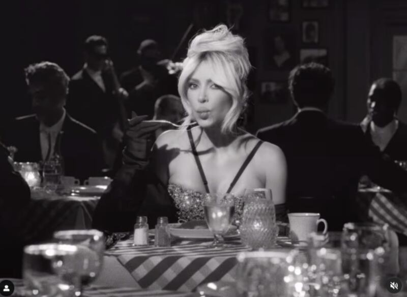 En el desfile, justo al fondo, se proyectó una cinta en blanco y negro de Kim Kardashian, degustando un plato de pasta en un restaurante, dicho video fue publicado por Kim en su Instagram con la leyenda: "Que empiece el espectáculo. #CiaoKim", para dar la bienvenida al show.
