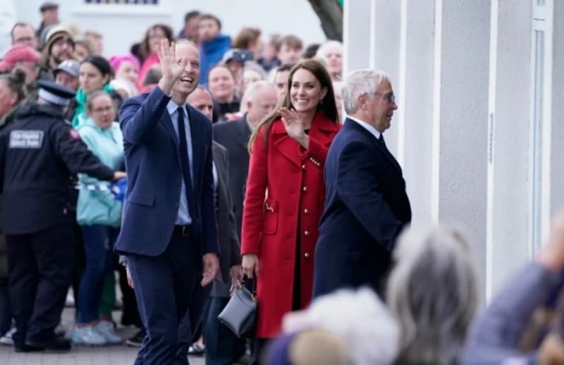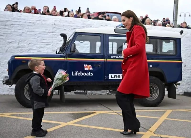 Kate y William lucieron sonrientes en su llegada a Gales, donde eran esperados por cientos de personas. La primera visita fue en la estación de botes salvavidas RNLI. En el lugar conocieron a la tripulación y un niño esperaba a Middleton con un ramo de flores que ella recibió emocionada.