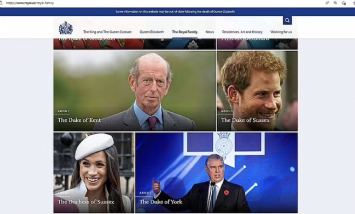 El hijo menor del rey y la ex estrella de Suits, que renunciaron a sus labores reales en 2020, quedaron relegados y degradados en la pestaña donde se ofrece una pequeña semblanza de cada uno de los integrantes de la realeza inglesa encabezada por Carlos III y la reina consorte Camila (75).