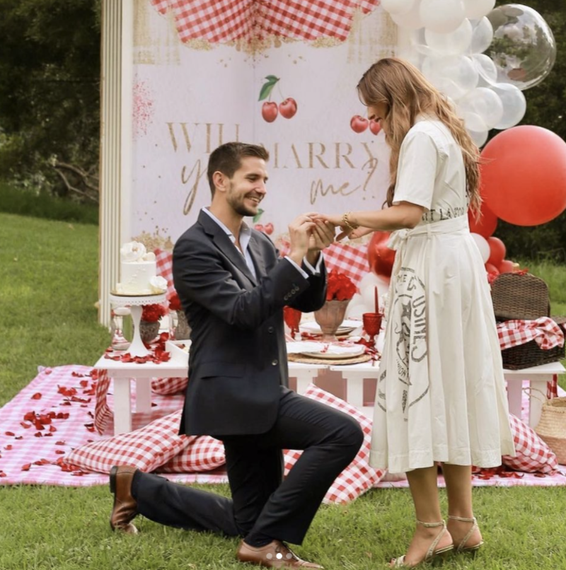 En una de las fotografías se ve a Rodrigo Saval, vestido con un traje casual arrodillado poniéndole la joya en el dedo, mientras Paulina, quien luce un vestido Dior, sonriente y sorprendida acepta el anillo.
