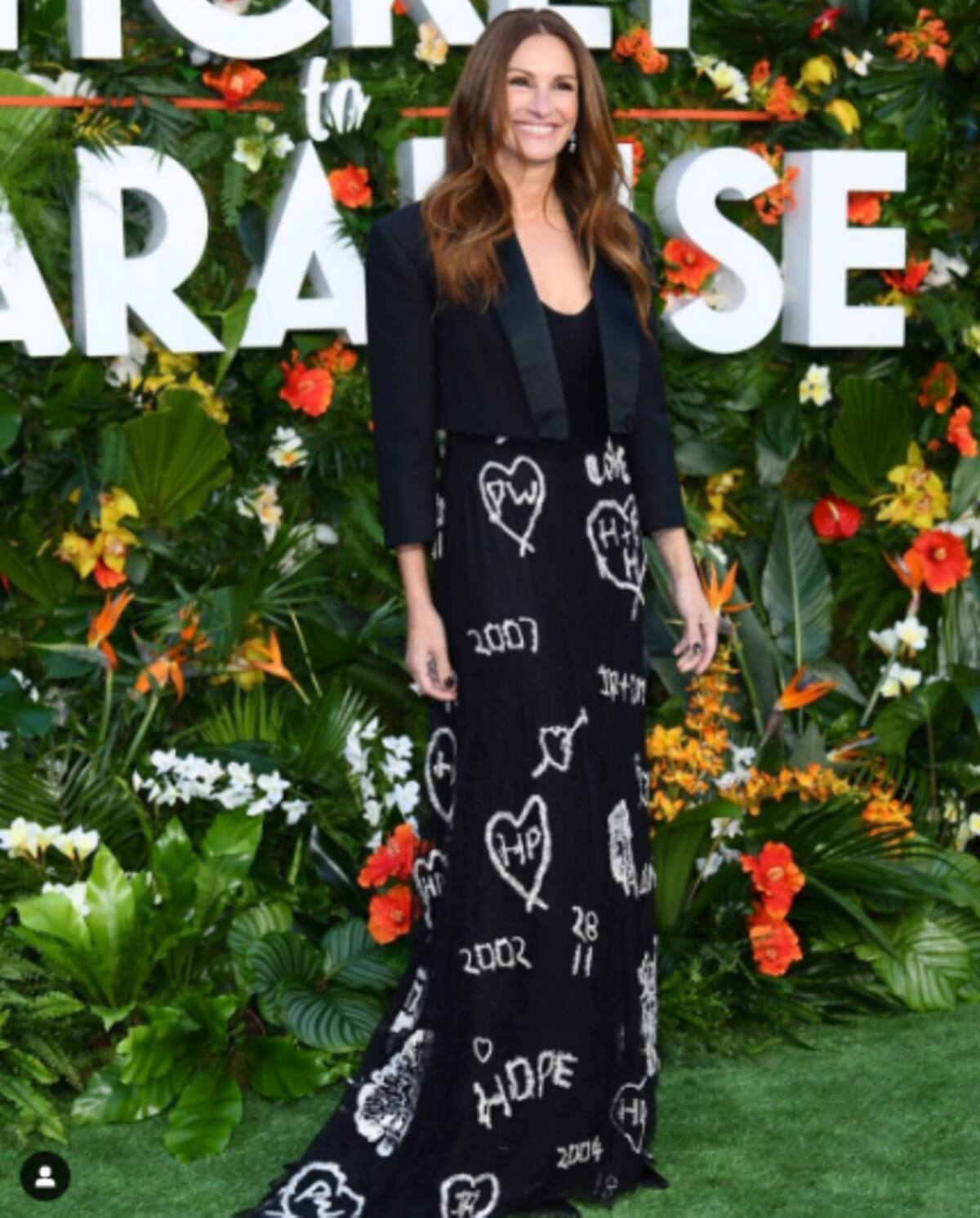La famosa protagonista de la cinta lució un vestido negro vanguardista, pero elegante con algunos estampados de corazones blancos, números e iniciales que parecían graffiti. Sin embargo, esos símbolos tienen un significado bastante trascendental para la actriz de Hollywood, pues representan las iniciales de personas y fechas importantes en su vida.