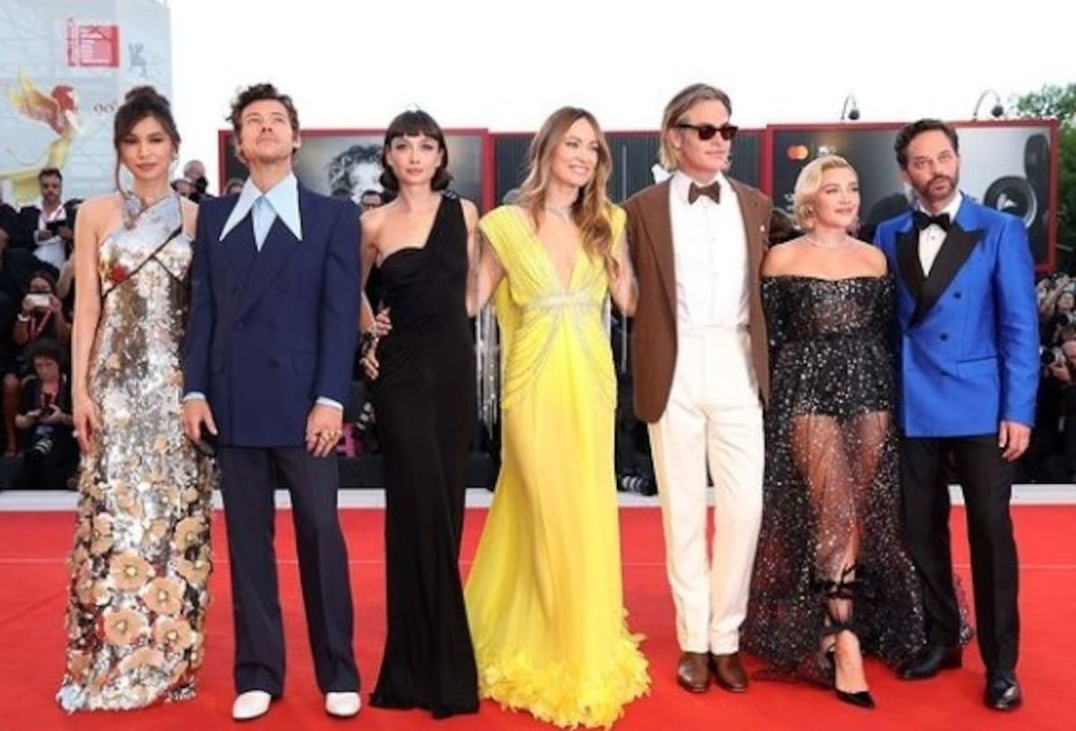 Florence Pugh y el elenco de la película se vieron enredados en la polémica por un supuesto escupitajo que le habría lanzado Styles a Chris Pine, durante la exhibición del filme en una sala de Venecia.
