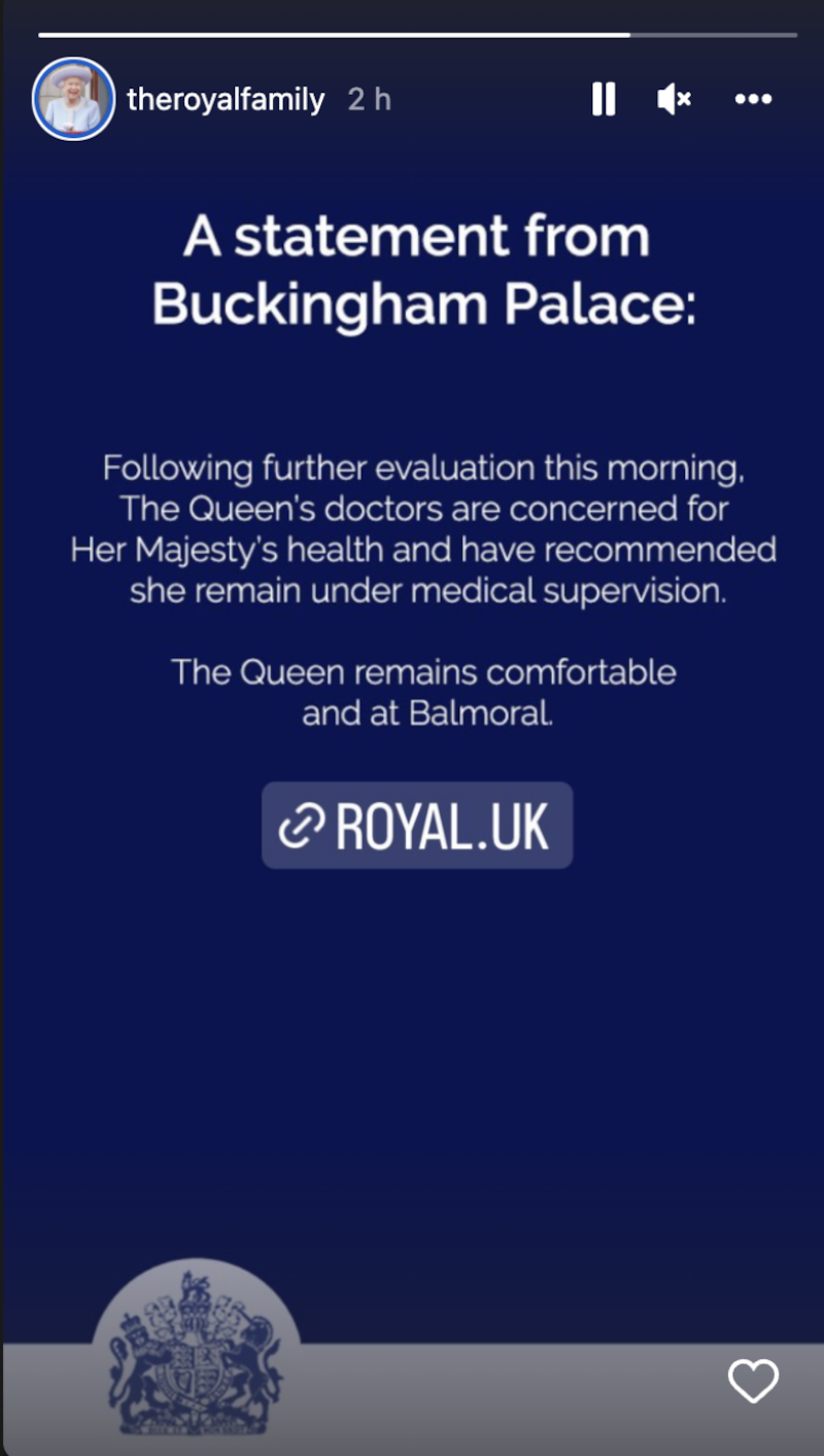 El Palacio de Buckingham publicó un comunicado en todas sus redes sociales que causó preocupación entre los ingleses, pues la salud de la reina Isabel II (96) alarmó a sus médicos. “Siguiendo la evaluación de esta mañana, los doctores de la reina están preocupados por la salud de Su Majestad y recomendaron que permanezca bajo supervisión médica”, se lee en el escrito.