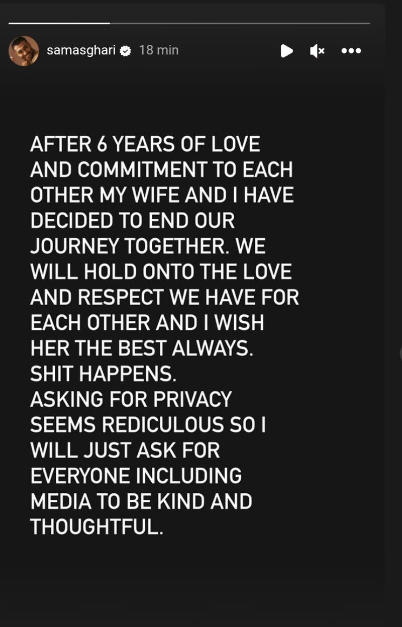 A través de un mensaje en sus historias de Instagram, el modelo dio a conocer su ruptura: “Después de 6 años de amor y compromiso mutuo, mi esposa y yo hemos decidido terminar nuestro viaje juntos”.