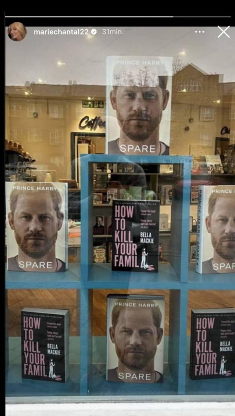 En sus historias de Instagram Marie-Chantal Miller compartió una imagen de una librería ofreciendo el libro del príncipe Harry, junto al libro “Cómo matar a tu familia”, cuestionando el daño que el duque de Sussex le ha hecho a su familia