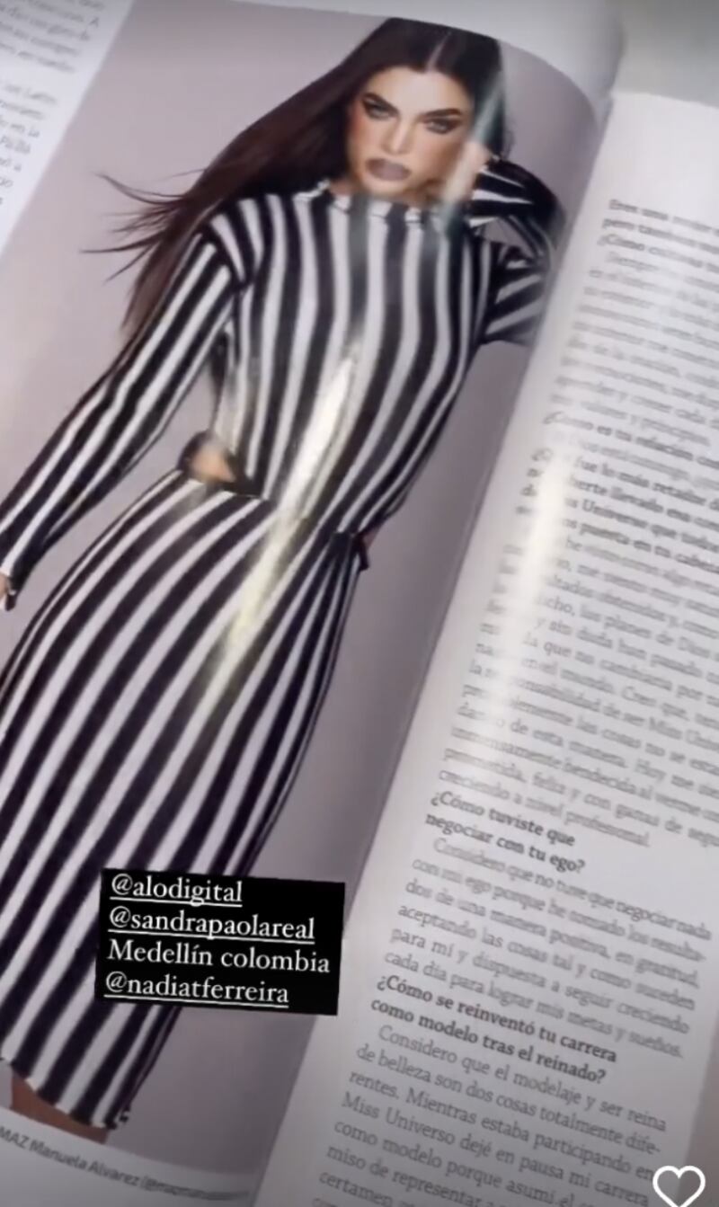 Este lunes, por medio de sus historias de Instagram, la modelo reposteó un video en el que se ve a una persona hojeando la revista en donde sale ella, primero modelando un vestido de rayas blancas y negras con el pelo muy lacio, largo y con los labios pintados de un intenso color oscuro, lo que le dio una apariencia similar a la del personaje interpretado por Jenna Ortega. Más de alguien teorizó con que la modelo paraguaya está probando diversas apariencias con vistas a su futura boda con el cantante puertorriqueño, que áun no tiene una fecha definida.