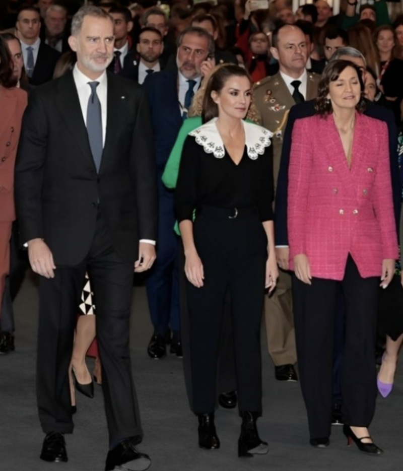 La reina Letizia (50) nuevamente dio de qué hablar con el look que usó en la edición 43 de la Feria de Turismo Internacional-FITUR en IFEMA-Madrid ya que usó un sofisticado jersey negro con cuello Peter Pan que recuerda al icónico estilismo de Merlina, la hija mayor de Los Locos Addams.