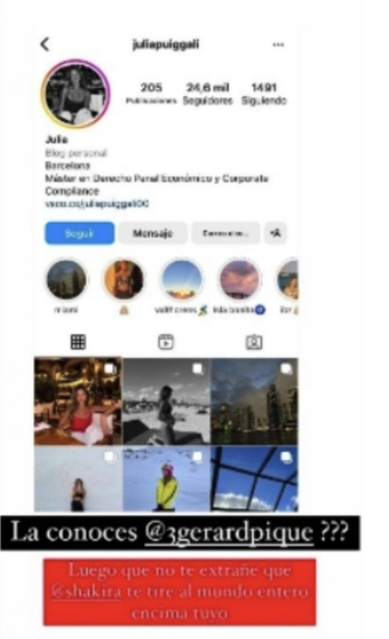 El comunicador subió a sus historias de Instagram una captura del perfil de la abogada con un texto amenazante hacia el futbolista:  "Julia Puig: ¿La conoces Gerard? Luego no te extrañe que Shakira te tire al mundo entero encima tuyo".