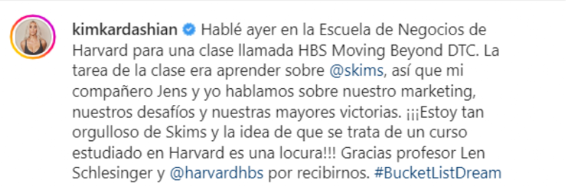 En la sesión anual llamada "Moving Beyong Direct-to-Consumer", la empresaria conversó por cerca de dos horas con los estudiantes sobre el desarrollo, los desafíos y las victorias que existen en el marketing, utilizando como ejemplo su marca. Kardashian se adentró en el mundo de la ropa interior y las fajas modeladoras, las que han despertado el interés de miles de clientes en internet por su efectividad para adaptarse a todo tipo de cuerpo.